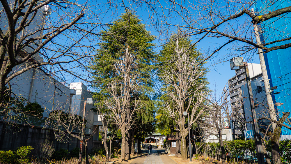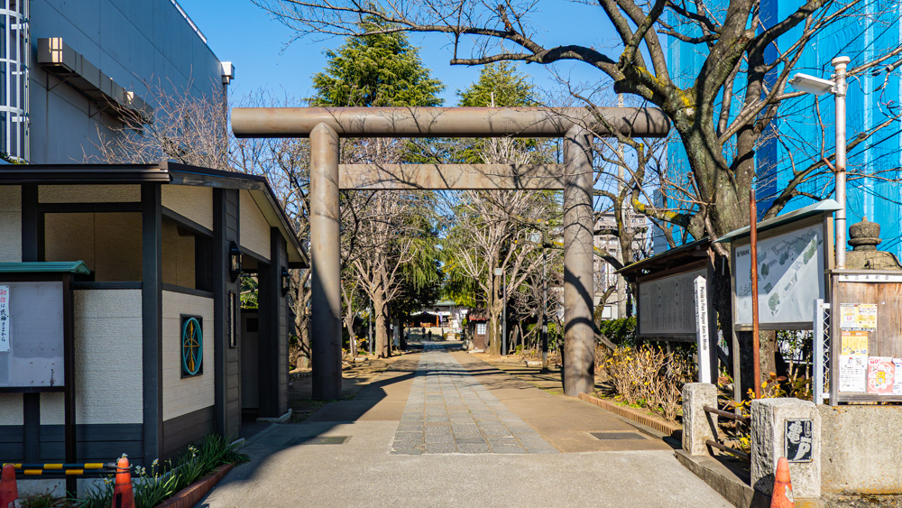 都道315号御徒町小岩線に面した一の鳥居をくぐり、静かな参道を進んでいくと、ほどなくして二の鳥居が姿を現します。参道沿いには店が並んでいるものの、この日は営業しているお店はほとんどなく、落ち着いた雰囲気の中でゆっくりと境内へ向かうことができました。